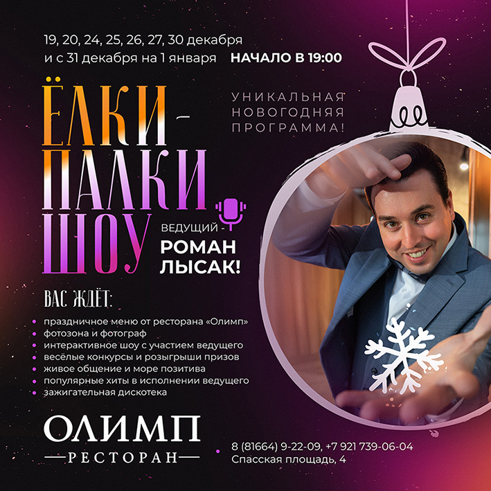 Новогодняя феерия в ресторане «Олимп»!Дорогие друзья! Готовы окунуться в атмосферу настоящего новогоднего волшебства? Представляем уникальную программу «Ёлки-палки шоу» с харизматичным ведущим Новгородского телевидения Романом Лысаком!